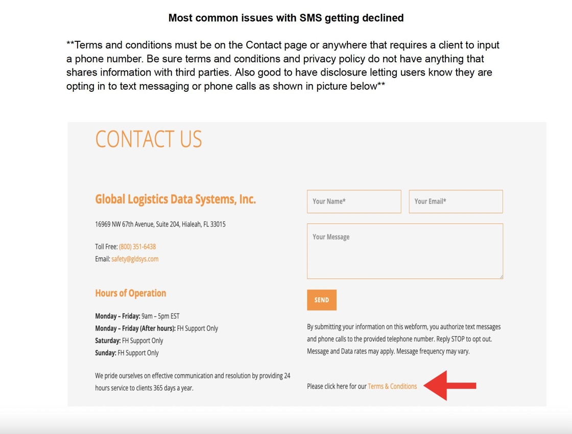 10. This is example of a contact page that passes regulations that are set forth. Note anywhere on a webpage a number is required, SMS disclosure is needed and a link that leads to terms and conditions is required.