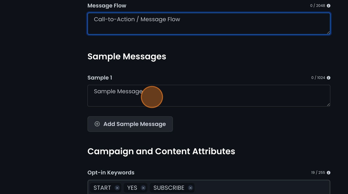 8. Click the "Sample Message" field. Messages Must include Brand name (Business name) and opt out and help disclaimer