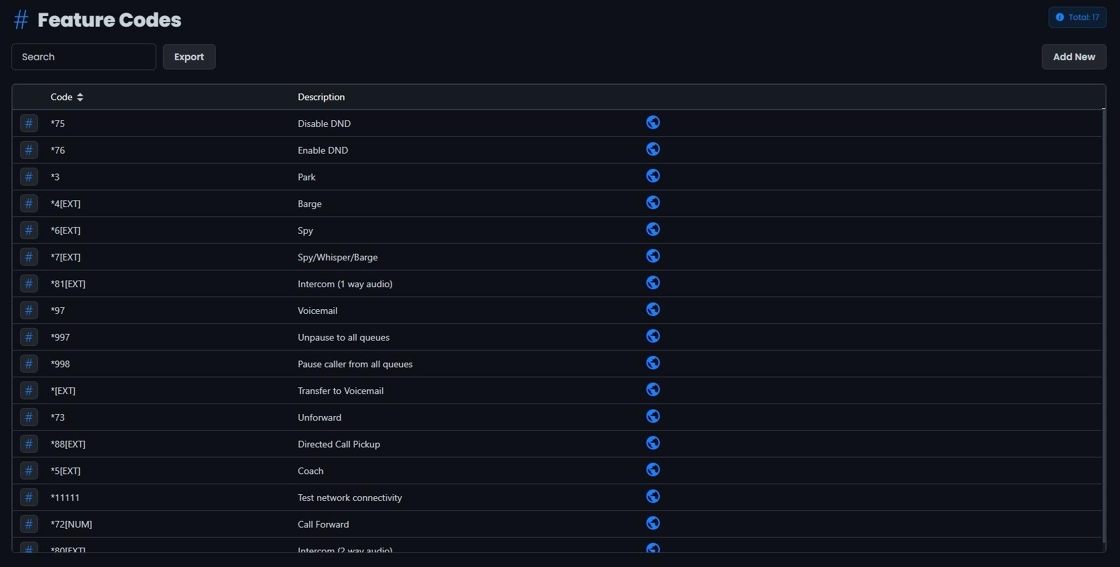 Note: Feature codes with a blue globe or world symbol are global across all Omnia accounts and cannot be deleted.